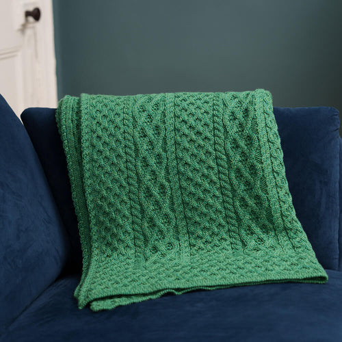 Intricately crafted with traditional Aran stitches, it exudes warmth and style. Made from 100% wool, available in cream or evergreen shades, it's the perfect accent for any home. Embrace luxury and comfort with this exquisite addition to your décor.
